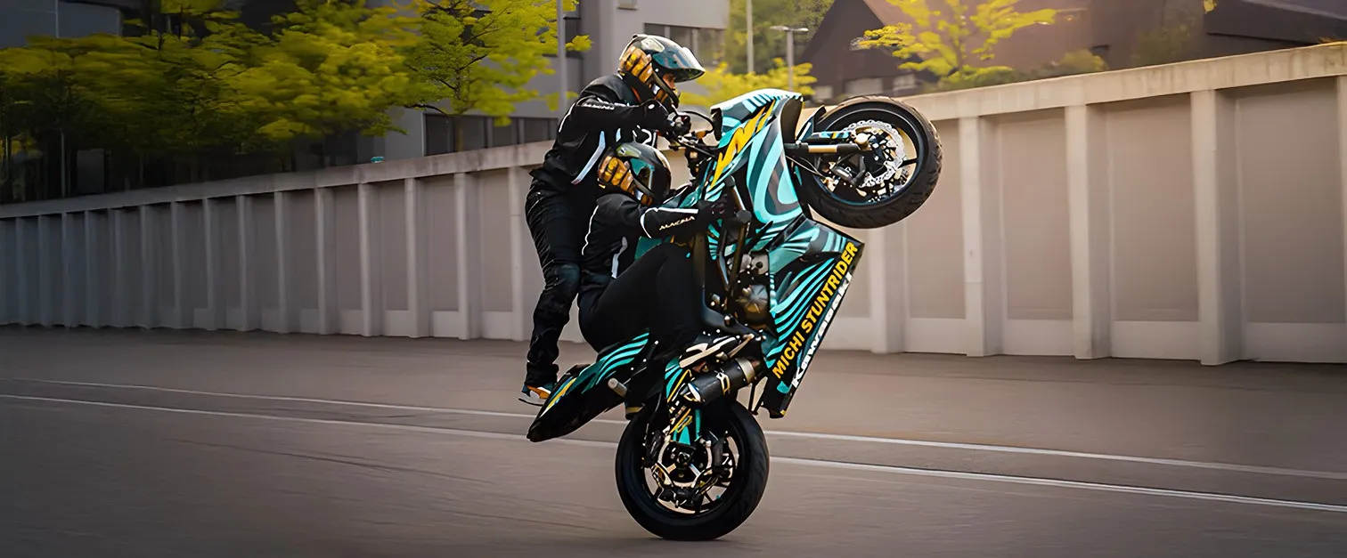 These two originate from Switzerland and trust each other completely, which you can clearly tell when watching their shows. The only thing they love more than stunt riding is each other and they’ve been performing together for more than 10 years. During those years, Michi’s and Kate’s feedback has been priceless for the (feminine) fit of our gear, and the level of comfort in different positions.