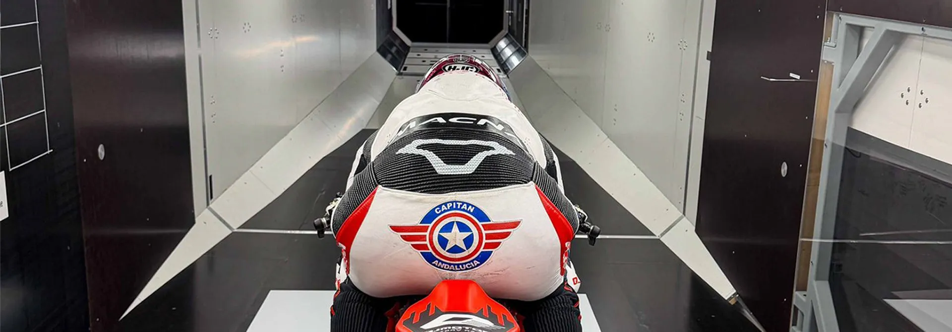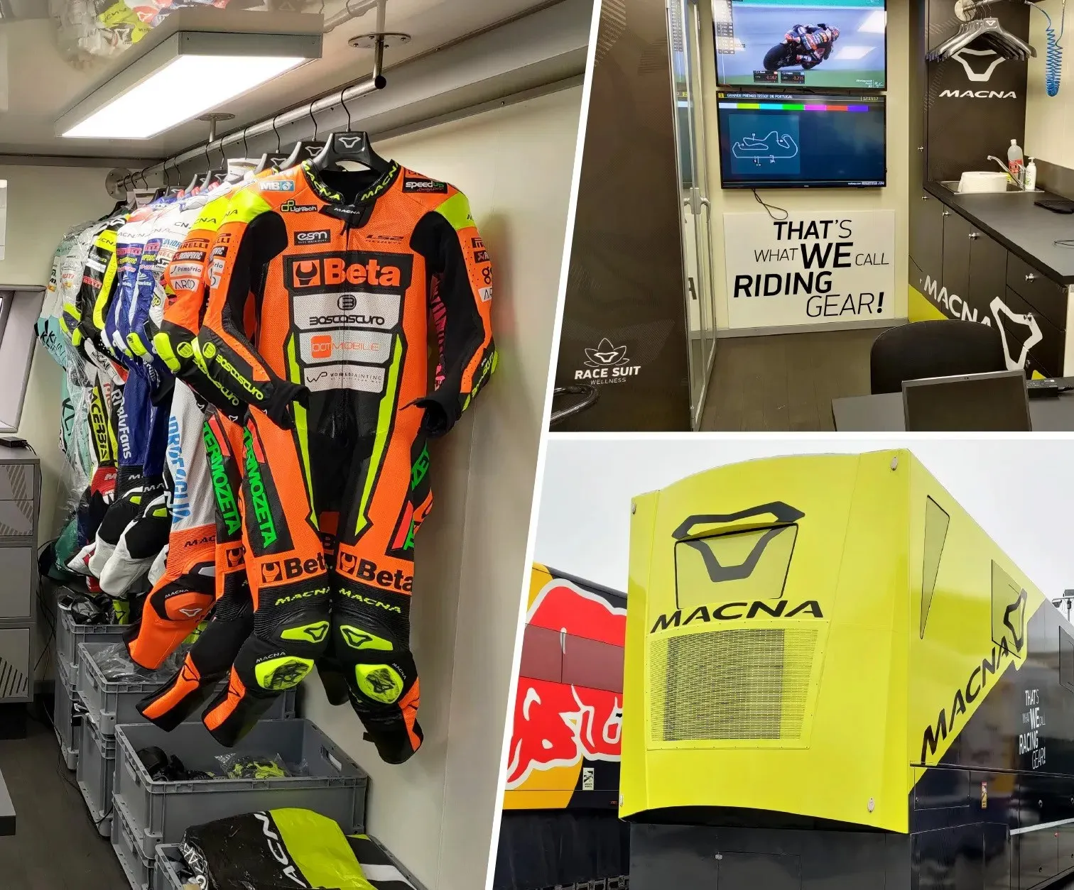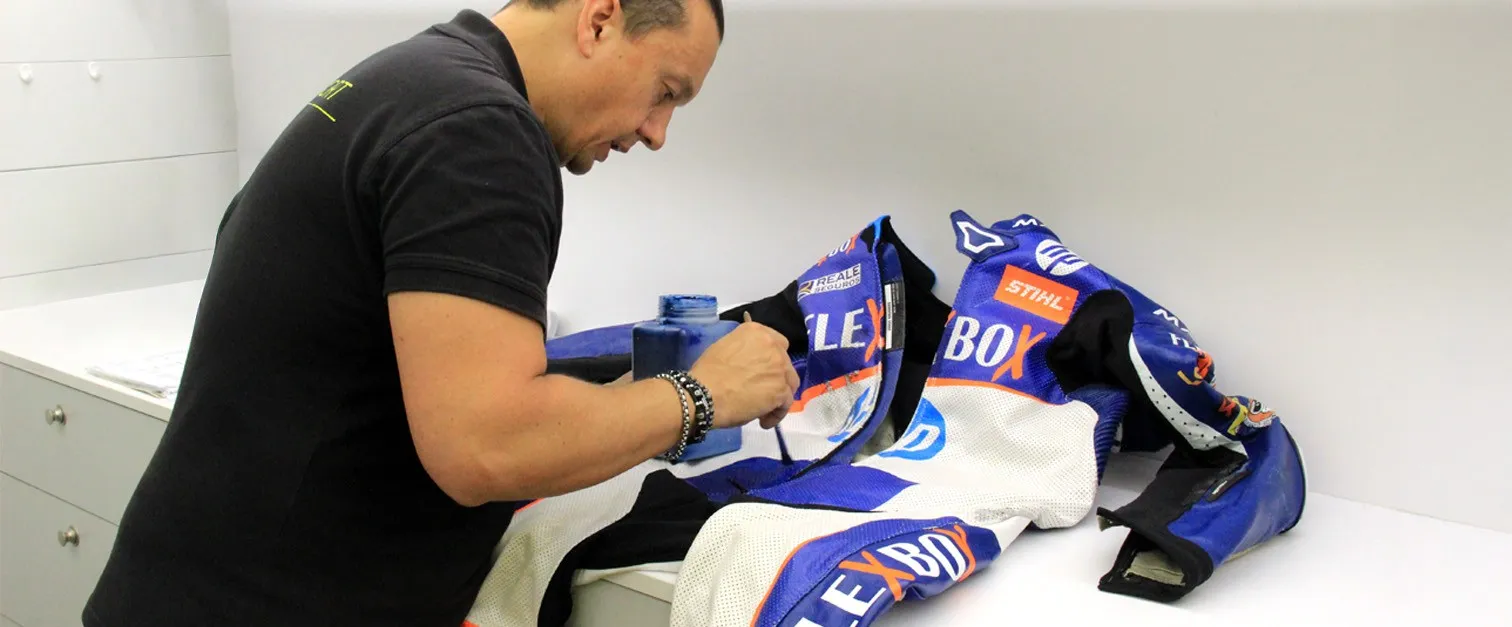 The service trailer is the workplace of our racing support team and parked at the MotoGP paddock during race weekends. They make sure the suits are inspected, cleaned, repaired, or even replaced for a new one if needed.