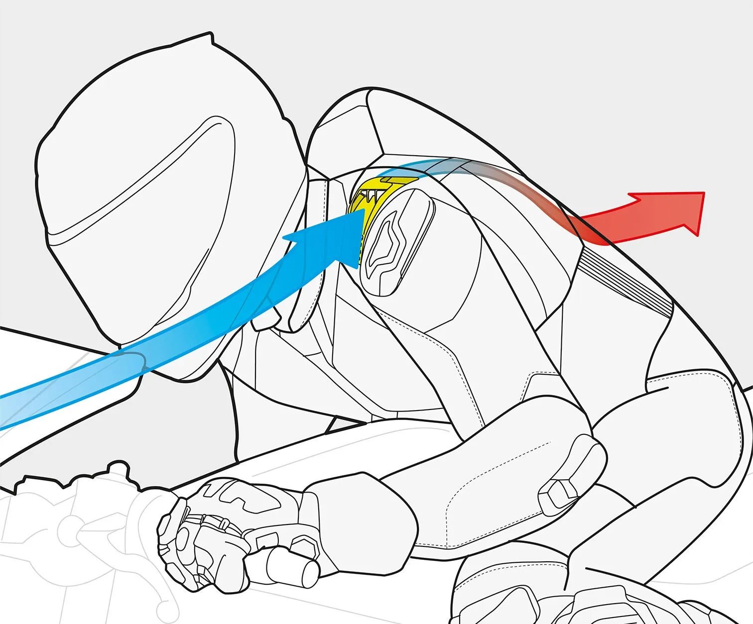 Intair™ ventilation at the shoulders consists of a solid, in-house developed part that is neatly incorporated into the garment to spark ventilation without compromising other factors such as aerodynamics.