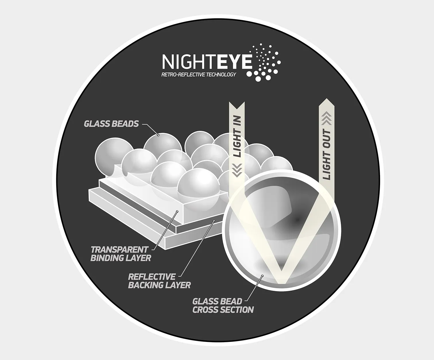 In tegenstelling tot traditionele reflectieve elementen kunnen we Night Eye™ gebruiken om grotere oppervlakken te bedekken zonder dat je bewegingsvrijheid wordt beperkt.