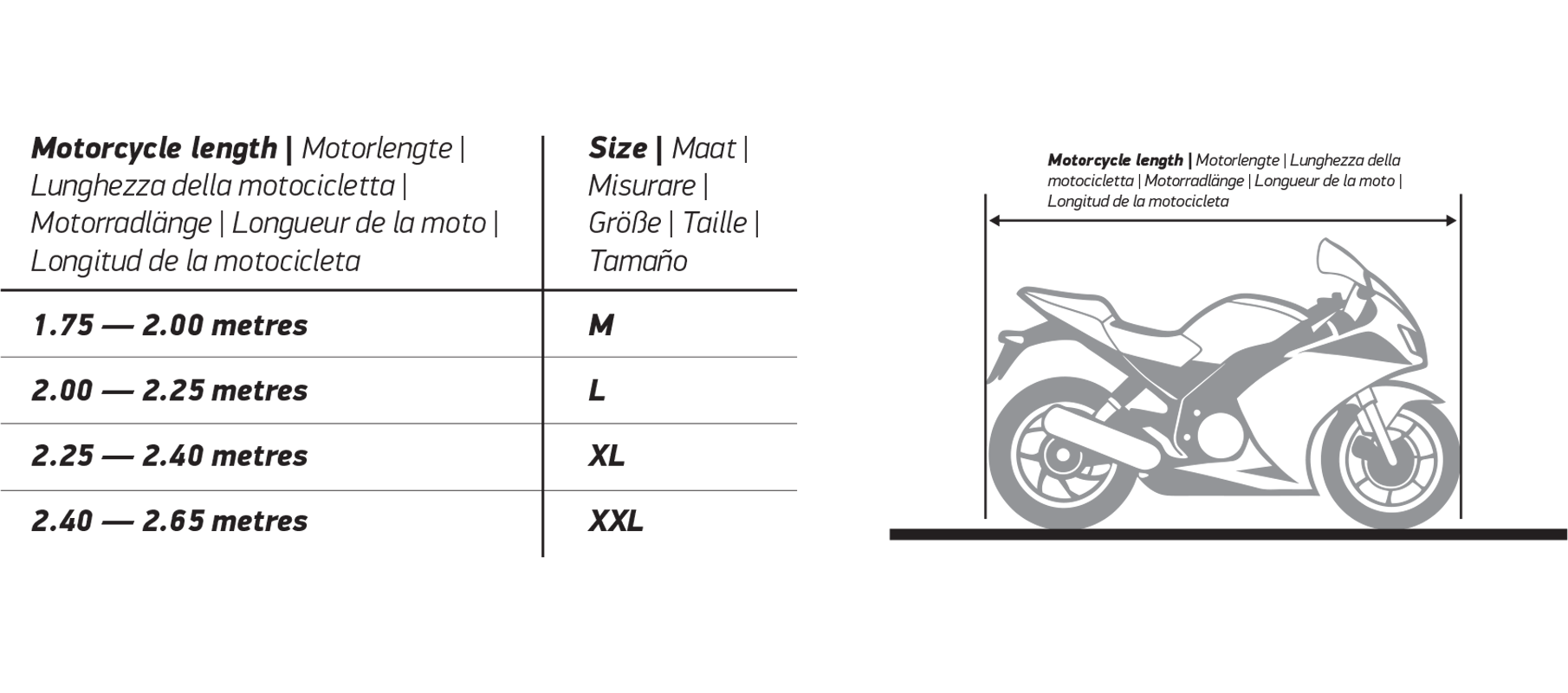 Protect your most-prized possession against the elements with a durable cover. Our Moto Mantles are unlike any other as we’ve incorporated decades of knowledge about motorcycle clothing into the designs. The unique shape ensures a superb fit and all covers feature our signature visual style, opposed to boring traditional covers. Each cover has double-stitched seams, heat-resistant lining, and comes with a storage bag. Check the products to see what makes each one of ‘em unique, or use the size chart to find the right size for your ride.